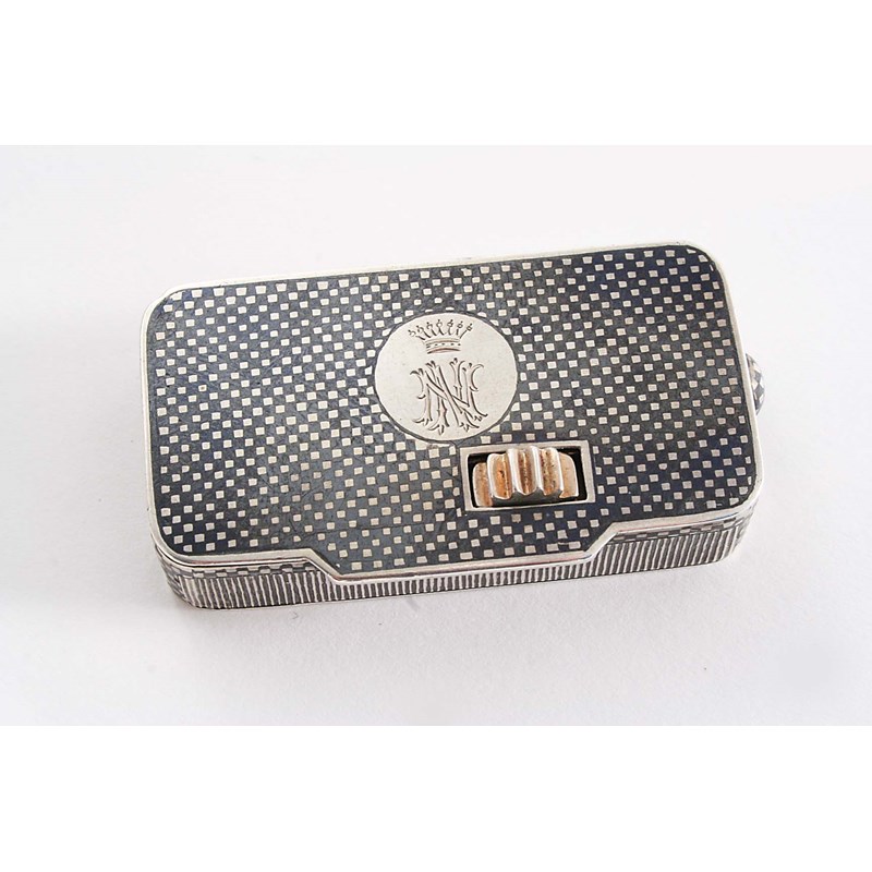 A LATE 19TH CENTURY AUSTRO-HUNGARIAN NIELLOWORK VESTA CASE & TAPER HOLDER COMBINED with a knurled wheel, engraved mongram & coronet & gilt interior, maker's mark "M&S", Vienna 1870-80; 2.2" (5.5 cms) long; 1.45 oz