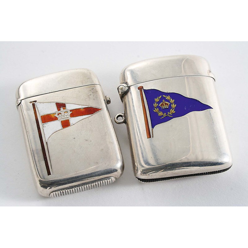 with a button opening, enamelled on the front with the burgee of the Royal Yacht Squadron, the reverse monogrammed, by George Unite, Birmingham 1876, and another enamelled with the Royal Corinthian Yacht Club burgee, maker's mark worn, Birmingham 1909; each approx. 2" (5 cms) long; 2.3 oz (2)