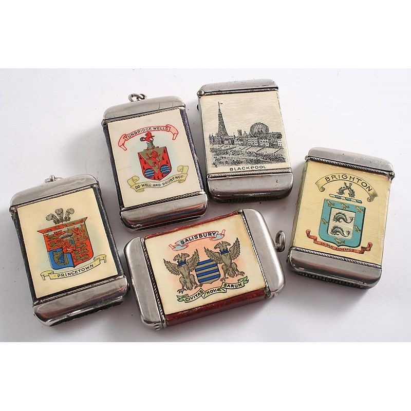 FIVE VARIOUS NICKEL-PLATED SOUVENIR VESTA CASES