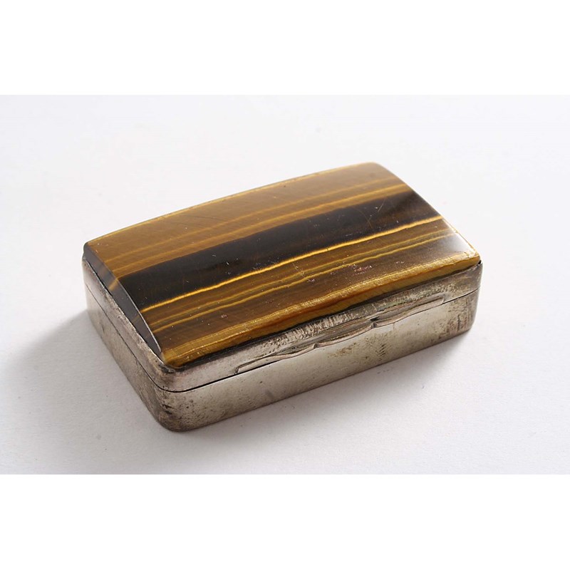 plain oblong with an inset steel striker, along the back and a panel of tiger's eye inset into the cover, gilt interior, by Alfred Fuller, London 1887; 2" (5 cms) long; 1.7 oz gross