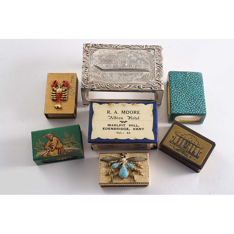 stamped with an Exhibition building n the front & "Glasgow 1901", by Deakin & Francis, Birmingham 1900 together with six other non-precious (gilt-metal, tin, etc) book match holders; the large one 3" (7.5 cms) long; 1.1 oz weighable silver (7)