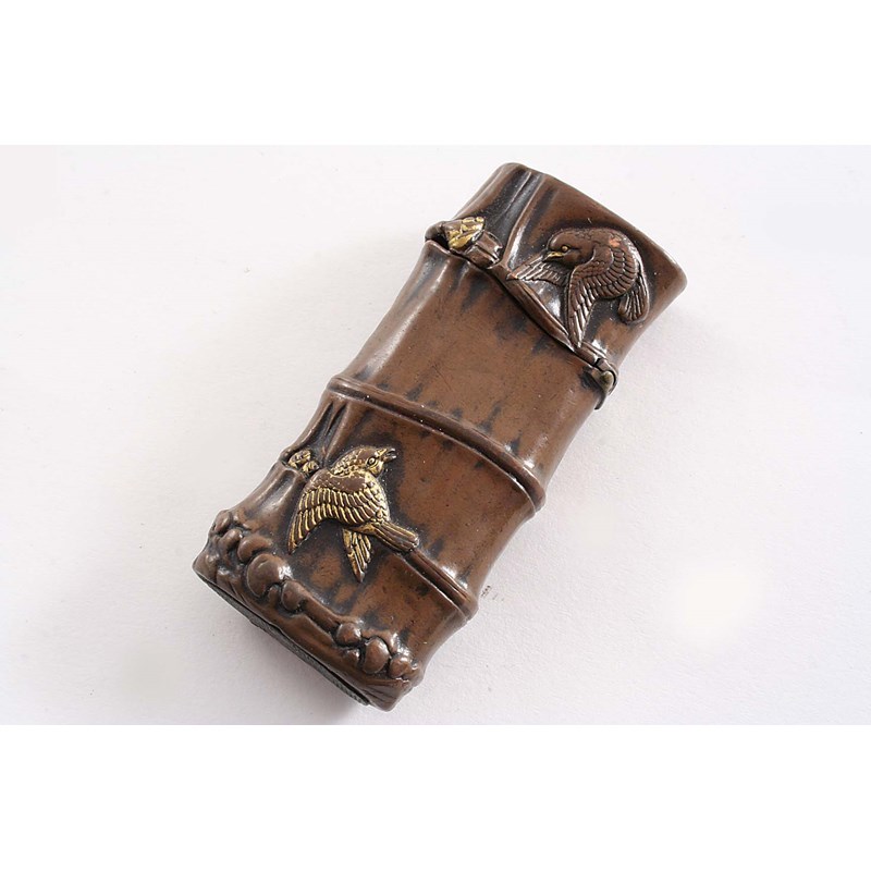 A LATE 19TH / EARLY 20TH CENTURY JAPANESE PATINATED COPPER VESTA CASE heightened with gilding in the form of a section of bamboo with Finches, c.1900; 2.6" (6.7 cms) long