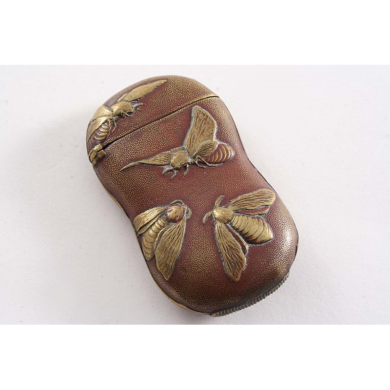 A LATE 19TH / EARLY 20TH CENTURY JAPANESE PATINATED BRASS VEST CASE of waisted form with bees in relief on both sides, c.1900; 2.1" (5.5 cms) long