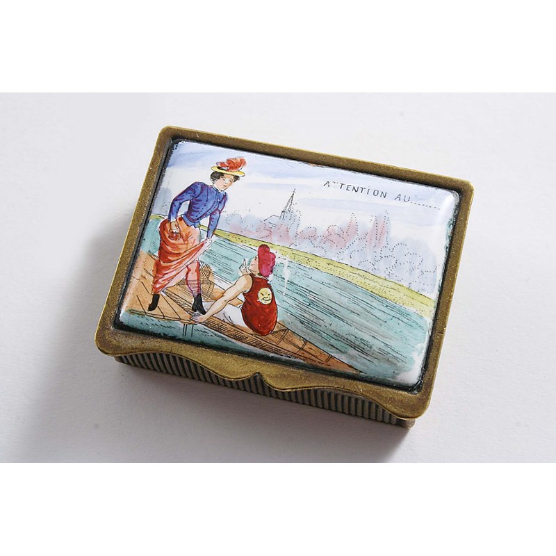 with a sprung cover, enamelled on the front with a lady about to embark on a rowing trip, the interior depicting the unfortunate consequences c.1900; 1.85" (4.2 cms) long