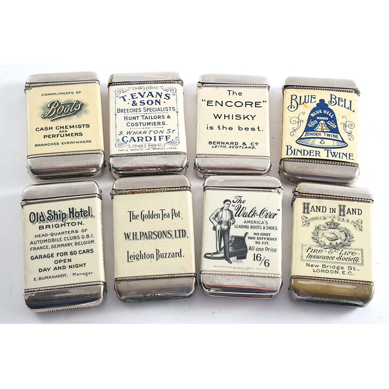 with celluloid, wrap around advertisements/promotional material, early 20th century, each approx. 2.3" (6 cms) long (8)
