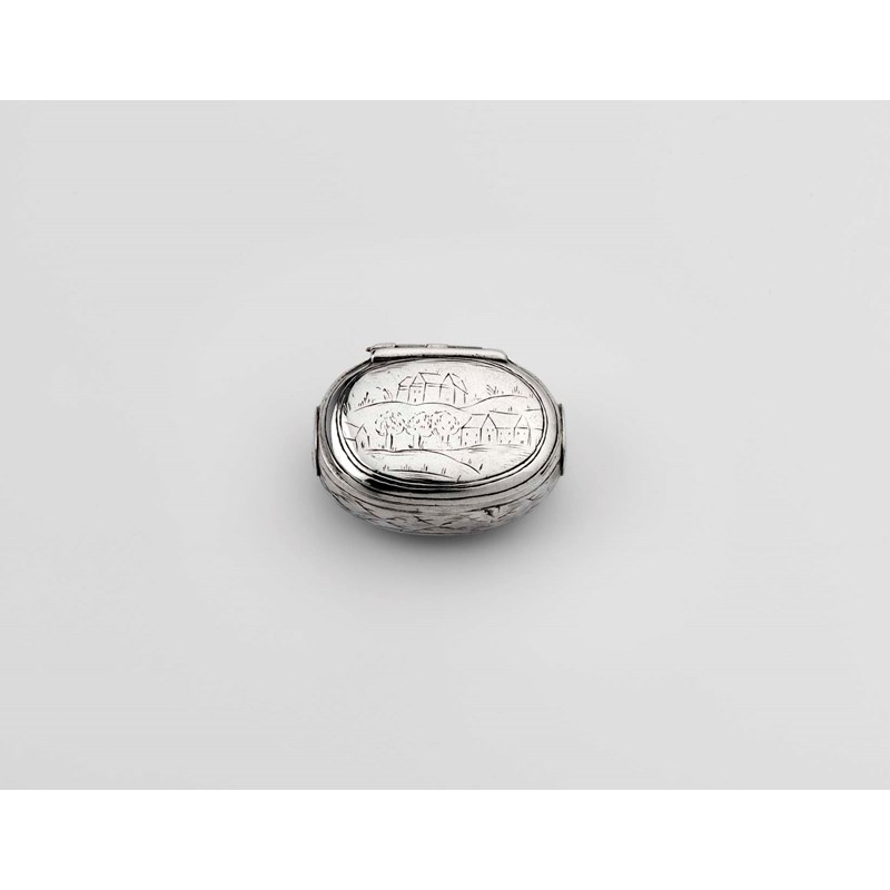 with a stiff leaf border around the sides and "squeeze" action, the cover with a hilly landscape of buildings & trees, maker's mark only "MR" below a crown, probably London c.1680; 1.25" (3.1 cms) long; 0.3 oz