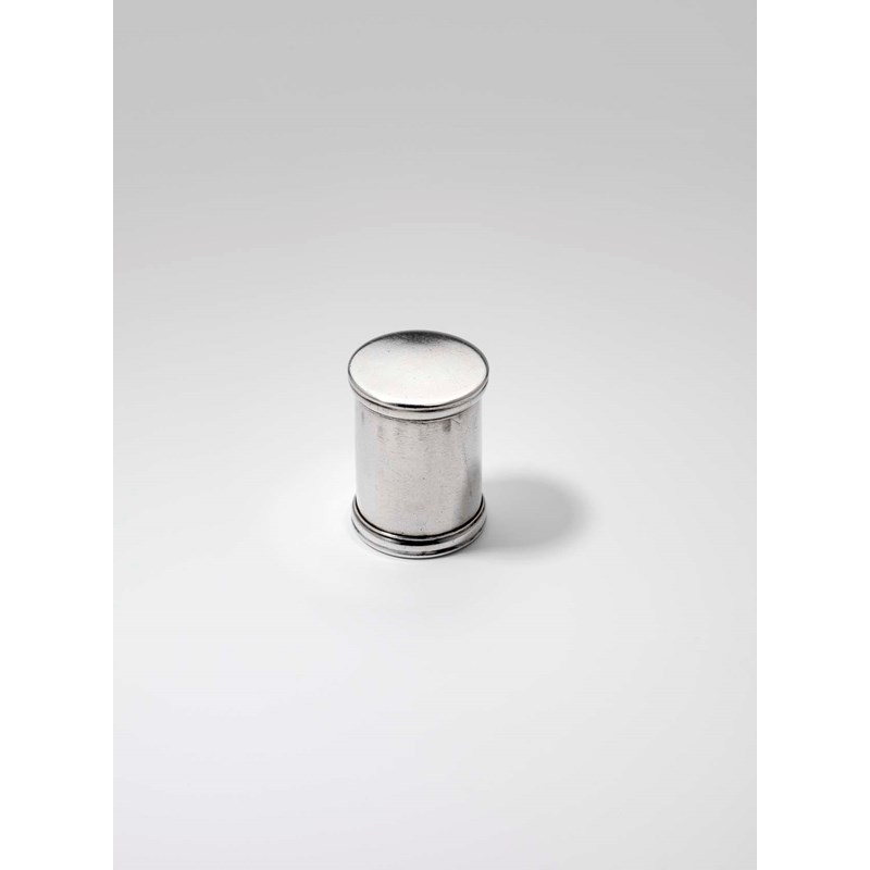 plain cylindrical form with moulded borders & a pull-off cover, the base initialled "AB" and struck once with the maker's mark "WB" (conjoined), possibly by William Balderson of Newcastle, c.1760; 1.25" (3.2 cms) high; 0.6 oz