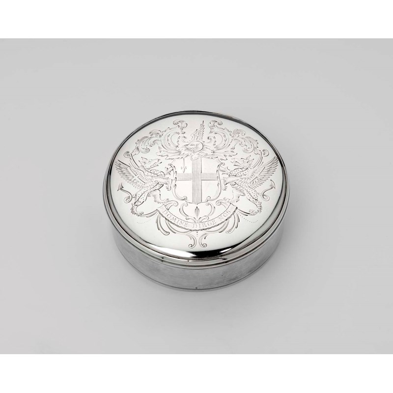 plain circular with a pull-off cover, engraved with the Arms, crest, supporters and motto of the City of London, the base inscribed "This Box together with the HONORARY FREEDOM of the CITY OF LONDON was presented by THE CORPORATION of the said CITY to JOHN DUNNING ESQ. M.P. Solicitor General to His Majesty on this day of our Lord 22nd October 1771", gilt interior, by Thomas Hall, London 1771; 4.3" (11 cms) diameter; 8.2 oz