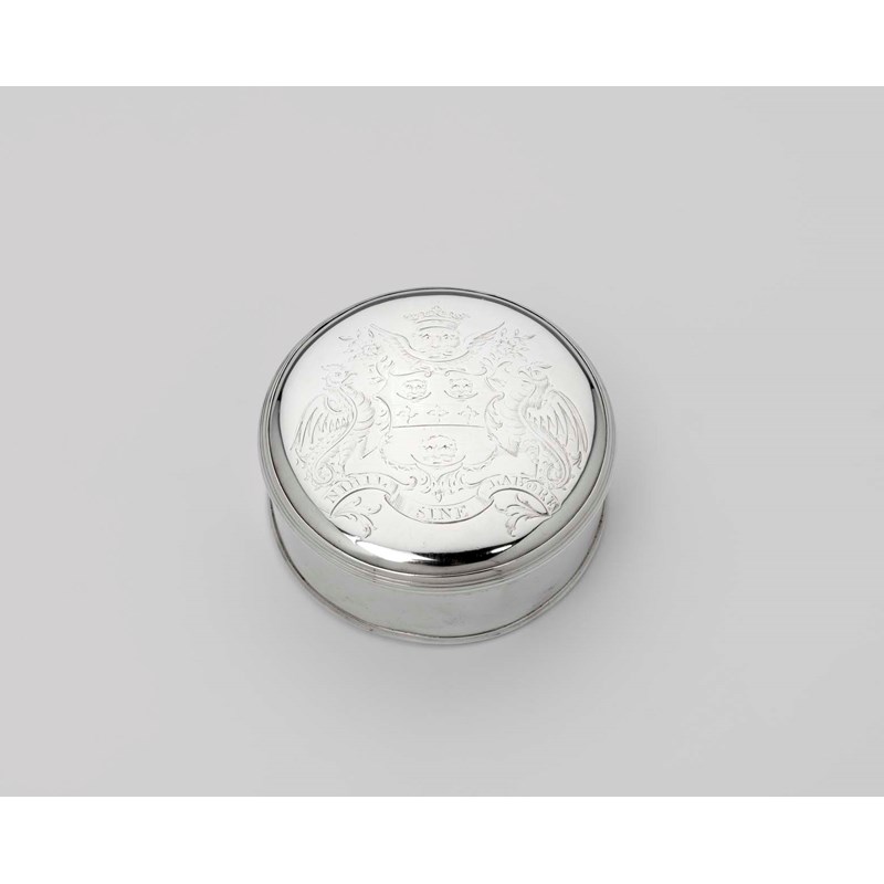 plain circular with reeded borders, the pull-off cover engraved with the Arms, crest, supporters and motto of the Corporation of Weavers, Dublin, the base inscribed "The Corpn. of Weavers UNANIMOUSLY Present the Freedom of their Guild to the Revd. THEOPHILUS BROCAS D.D. DEAN OF Killala For his Laudible Endeavours in the Service of this Kingdom and the Promoting its Arts and Manufacturers Weavers Hall Dublin 1st July 1766", gilt interior, maker's mark "IS", Dublin c.1766 (no date letter); 3.2" (8 cms) diameter; 4.1 oz