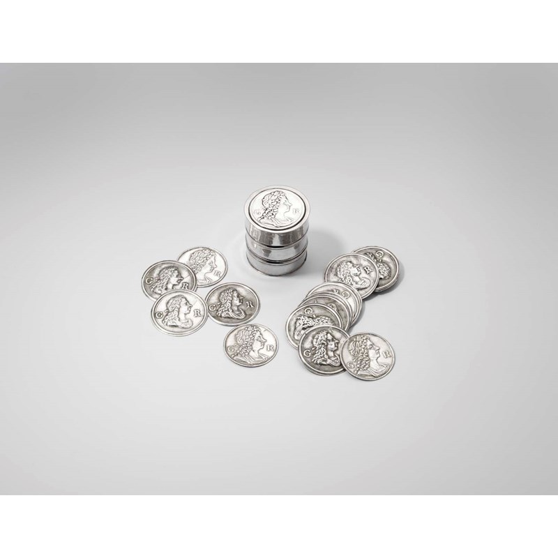 of squat cylindrical form with moulded borders, the cover die-stamped with a portrait of King George I in profile between the initials "G" & "R", containing twenty one similarly die-stamped counters, struck with the maker's mark "AL" and the lion's head erased, twice, by John Albright, London c.1720; 1.15" (2.8 cms) high; 1 oz
