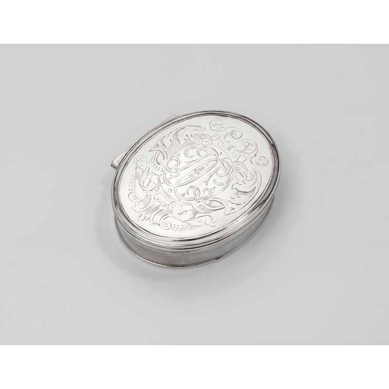 oval with moulded borders and a "stand-away" hinge, the cover engraved with the script cypher "TC" within a foliate scroll cartouche, maker's mark only "WG" below a Bishop's mitre, possibly by William Gatliffe or Gattliffe, (Grimwade No.3879), London 1720-1725; 3.75" (9.5 cms) long; 4.5 oz