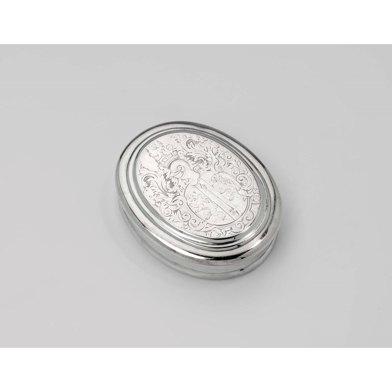 with plain moulded borders, the pull-off cover engraved with a crest and coat of arms within an oval cartouche, flanked by mural & scrolled mantling, by Thomas Ash, London 1708; 3.8" (9.7 cms) long; 3.5 oz