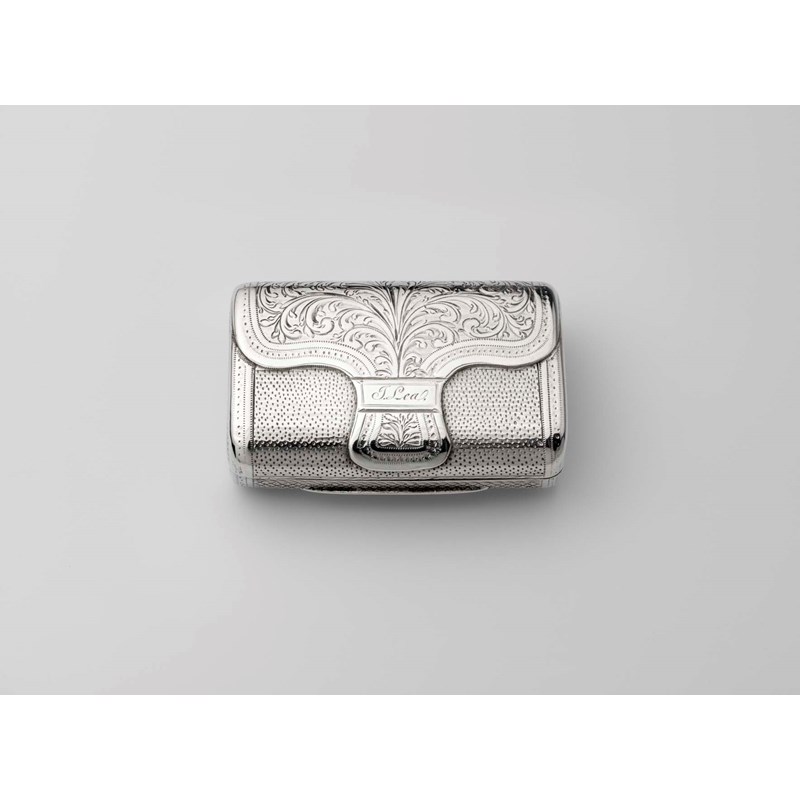 resembling a clutch bag or purse, the clasp inscribed "J.Lea", the base with a small vacant rectangular cartouche, gilt interior, by William Edwards, London 1817; 2.5" (6.5 cms) long; 1.9 oz