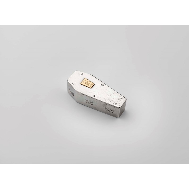 in the form of a coffin with engraved handles and screw heads and a small applied gold plaque, engraved with a skull and crossed bones and the date "1812", gilt interior, maker's mark, duty mark & lion passant (all struck twice), by William Welch of Exeter c.1812; 2.25" (5.7 cms) long; 1.3 oz