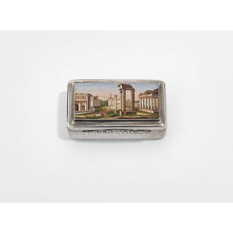 with reeded sides, a chased thumbpiece and an engine-turned base, the cover inset with a micromosaic panel depicting a view of the Forum, Rome, gilt interior, by Edward Edwards, London 1832; 2.35" (6 cms) long