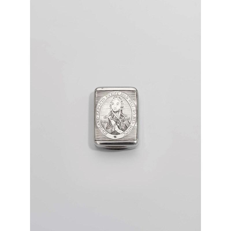 rectangular, engraved on the cover with a portrait of Admiral Lord Nelson within an oval frame, inscribed "England Expects EVERY MAN WILL DO HIS DUTY", the base with a flower head motif, the gilt interior with a die-stamped grille depicting a view of the "Victory", Nelson's flagship and the script "TRAFAGAR OCR.21.1805" by Matthew Linwood, Birmingham 1805; 1.25" (3.2 cms) long; 0.5 oz