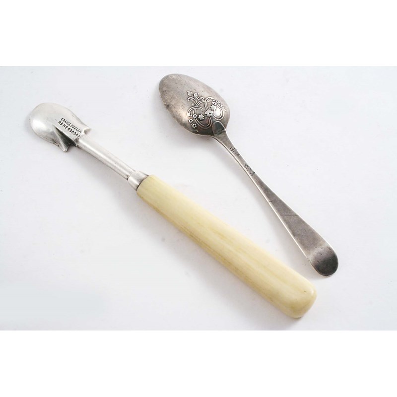 with a looping scroll and a floral garland below the drop, maker's mark and lion passant only, by Hester Bateman, London c.1770 and a plated "patent" orange peeler with an ivory handle; the peeler 5.1" (13 cms) long; 0.3 oz weighable silver (2)