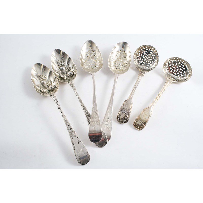 crested, by John Harris, London 1826, another similar, also crested, by Mary Chawner, London 1837 and four George III table spoons with later "berry" decoration; the sifters 6.5" (165 cms) long; 11.9 oz (6)