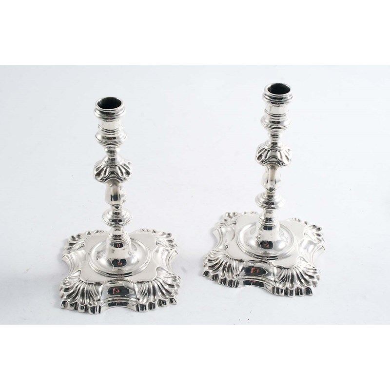 in the George II style with shaped square bases, shell decoration and spool-shaped capitals, crested, by Sebastian Garrard, showing Jubilee hallmarks, London 1934; 4.9" (12.2 cms) high; 10.9 oz (2)