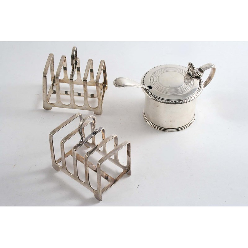 with a gadrooned border, & blue glass liner, by William Fell, London 1830 together with a William IV fiddle & Thread pattern condiment ladle and a pair of small toast racks by James Dixon & Sons, Sheffield 1934; the latter 3" (7.5 cms) long; 9.4 oz weighable silver (4)