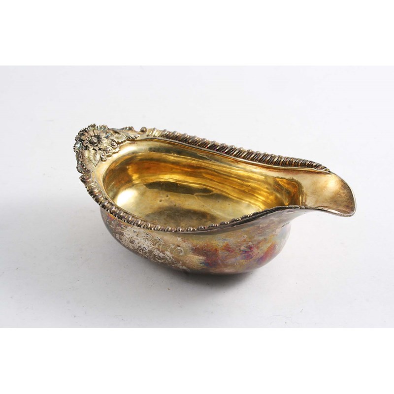 A GEORGE V PAP BOAT with a border of gadrooning and a floral & foliate detail at the back of the bowl, gilt interior, by Joseph Angell, London 1823; 5.1" (13 cms) long; 3 oz