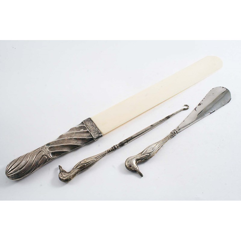 by E.S. Barnsley, Birmingham 1889 and an Edwardian mounted steel button hook & shoe horn with duck handles, by Crisford & Norris, Birmingham 1907; the page turner 16" (40.5 cms) long (3)