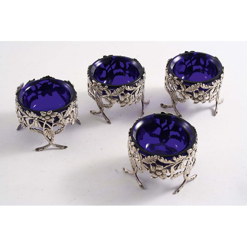 A set of four early Victorian naturalistic openwork salts with leaves & flowers around the sides and legs formed from the flower stalks, blue glass liners, by Joseph Wilmore, Birmingham 1837; 2.3" (6 cms) diameter; 7.5 oz weighable silver (4)
