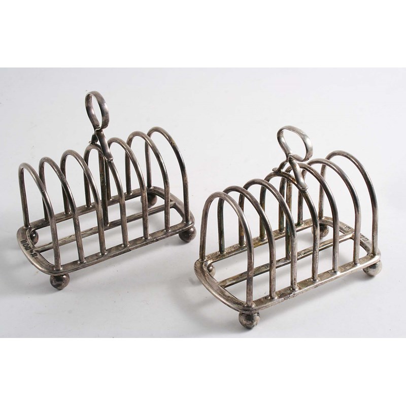 A PAIR OF LATE VICTORIAN TOAST RACKS with seven arched bars and ball feet, by W. Gibson & J. Langman, London 1897; 4.5" (11.5 cms) long; 13.5 oz (2)