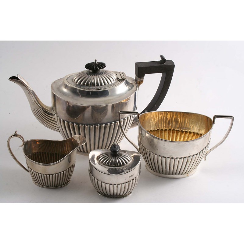 inscribed, and a matching sugar bowl by Joseph Gloster Ltd., Birmingham 1910/1911 together with an Edwardian tea caddy by G. Jackson & D. Fullerton, London 1904 and a milk jug by Mappin & Webb, Sheffield 1891; the tea pot 6.7" (17 cms) high; 31.1 oz (4)