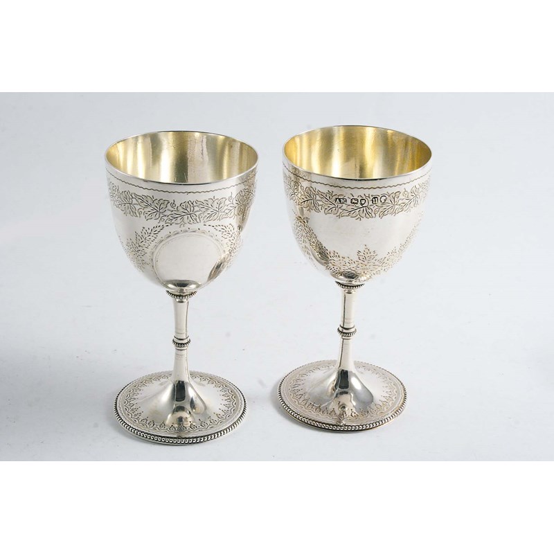 A PAIR OF VICTORIAN SMALL ENGRAVED GOBLETS with vacant oval cartouches & beaded circular bases, by Alex Macrae, London 1868; 4.75" (12 cms) high; 6.25 oz (2)