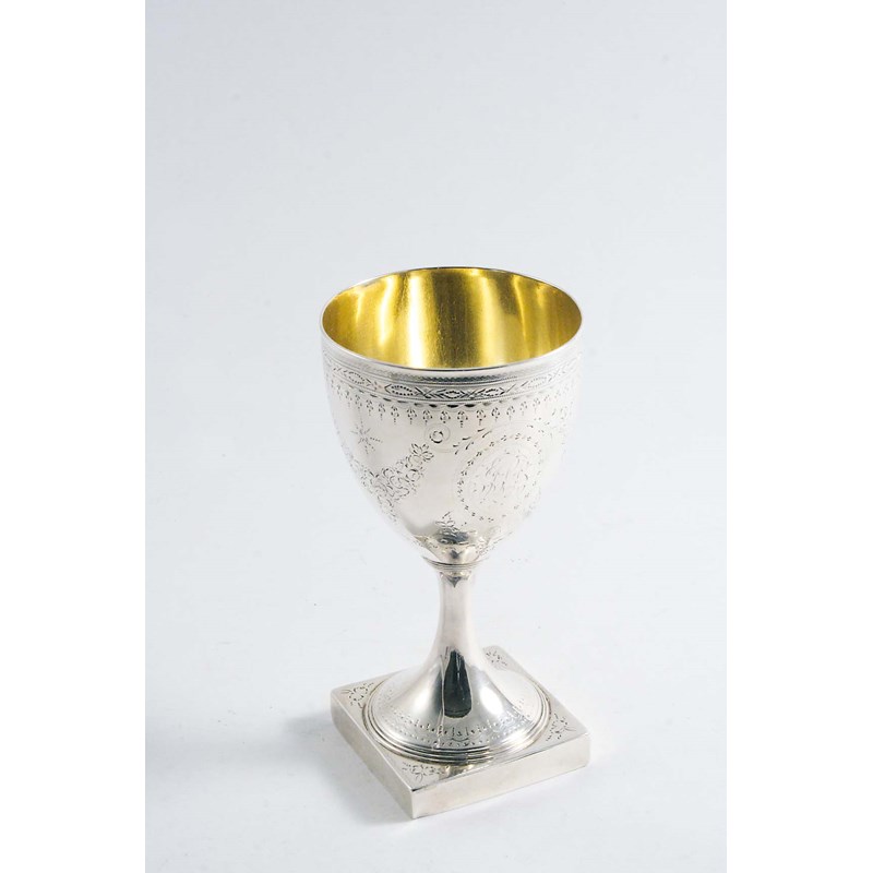 A GEORGE III BRIGHT-ENGRAVED GOBLET on a square pedestal foot, initialled, gilt interior, by Hester Bateman, London 1788; 6.1" (15.5 cms) high; 5.9 oz