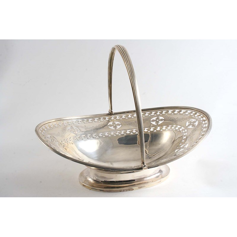 with a reeded border and swing handle, the interior pierced and engraved with borders of floral garlands and wave-like scrolls, & a vacant central cartouche, by John Edwards, London 1798; 14.2" (36 cms) long; 32.5 oz