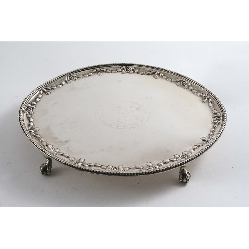 with a beaded rim, ball & claw feet and a chased border of paterae and garlands of bell flowers, the centre with an engraved armorial, by Richard Rugg, London 17876; 8.75" (22.2 cms) long; 12.9 oz