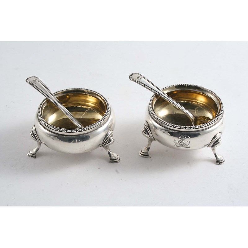 with bead borders & gilt interiors, crested, by D & C. Houle, London 1869 and a pair of salt spoons, initialled "M", by George Adams, London 1868; the salts 2.25" (5.5 cms) diameter; 3.7 oz (4)