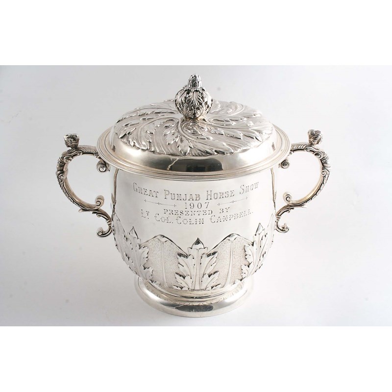 "Great Punjab Horse Show 1907 presented by Lt.Col.Colin Campbell", in the form of a Charles II porringer & cover, with repousse work stiff leaves and a bud finial, the reverse inscribed "CHAPION PONY - COLOURBLIND, OWNER T. BOUCH", by J.B. Carrington, London 1905; 9.75" (24.8 cms) high; 55.8 oz