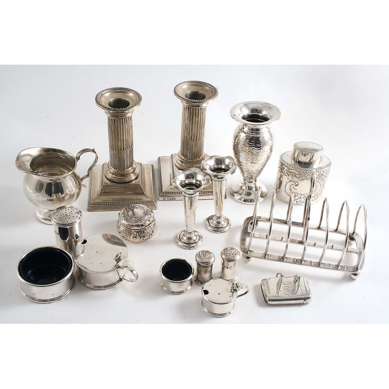 A pair of late Victorian dwarf column candlesticks by Hawkesworth, Eyre & Co., Sheffield 1896, a toast rack, three small vases, a tea caddy, a cream jug, a vesta case, a small box, one three-piece condiment set and one four-piece condiment set; the candlesticks 5" (12.5 cms) high; 18.6 oz weighable silver (17)