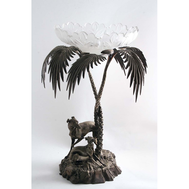in the form of twin palm trees & two greyhounds or whippets on a foliate & rockwork base, with cut-glass & frosted dish, maker's mark partially worn, 1850-70; 17.7" (45 cms) high overall