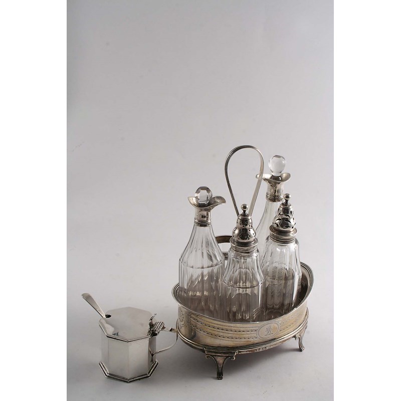 with a loop handle, engraved borders and an inset wooden base, crested, with four mounted cut-glass bottles and a jar (incomplete), by Robert & David Hennell, London 1800 together with an octagonal mustard pot, by Page, Keen & Page, London 1912 (with a blue glass liner & a George III salt spoon); the cruet frame 9.75" (24.8 cms) high; 3.6 oz weighable silver (3)