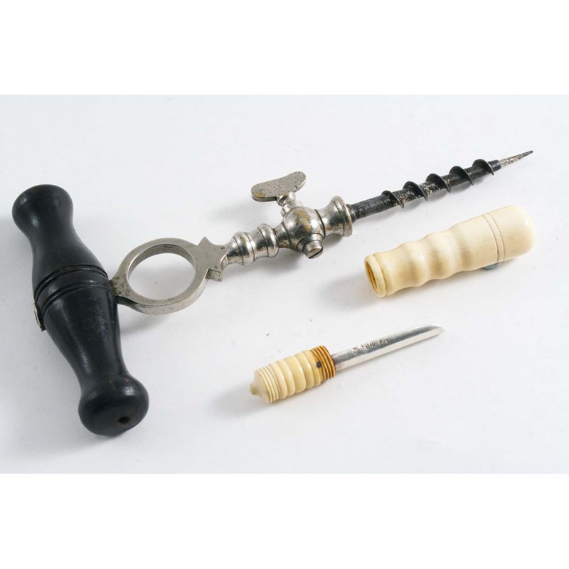 with a turned handle, the black screwing into the handle when not in use, maker's mark mis-struck, Glasgow 1885 and a nickel plated champagne tap with a turned wooden handle; the latter 7" (17.8 cms) long (2)