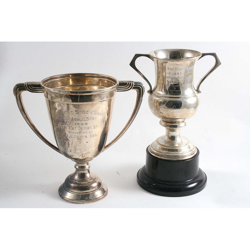 by Adie Bros., Birmingham 1934 and a smaller trophy cup with a baluster body, by another maker, Birmingham 1935, both inscribed as prizes for the "Yeovil Fat Stock Society...."; the larger one 8.5" (21.5 cms) high; 25.4 oz (2)
