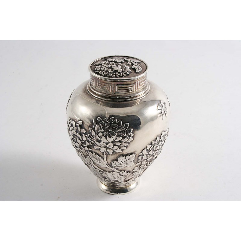 in the style of a Chinese example of vase form with embossed Chrysanthemum flowers and a pull-off cap, the base incised "CKC & SONS SILVER B'LORE"; 4.55" (11.5 cms) high; 6.25 oz