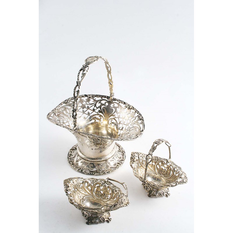 with a swing handle, applied borders and a circular foot, by G. Jackson & D. Fullerton, London 1907 and a pair of small bonbon baskets by H. Matthews, Birmingham 1896; the larger one 6.6" (17 cms) long; 11.75 oz (3)