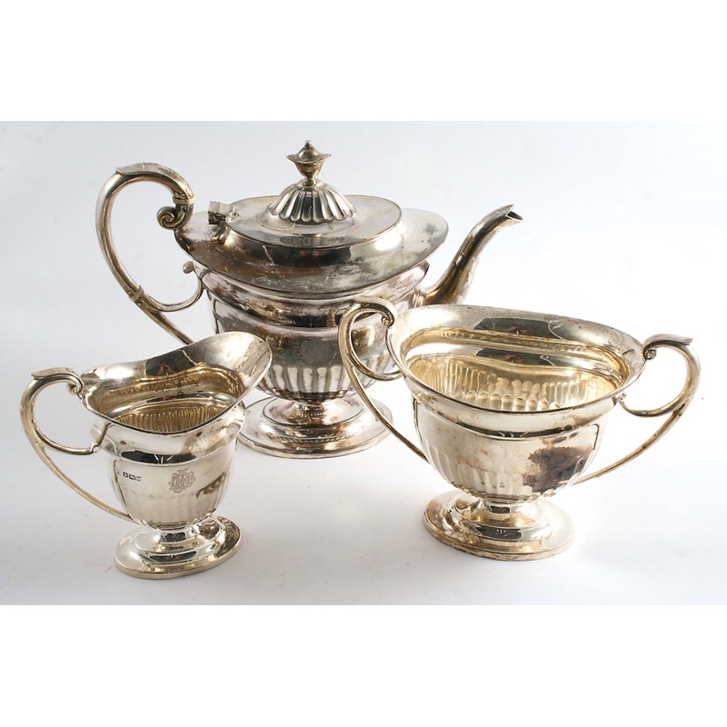 with oval bodies decorated with part fluting, oval pedestal bases and upswept scroll handles, monogrammed, by Martin Hall & Co., Sheffield 1913; the tea pot 8" (20.2 cms) high; 44.3 oz (3)