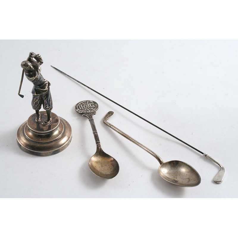 An early 20th century figure of a golfer taking a swing, on a circular base, maker's mark "T&S", Birmingham 1933, two golf-related tea spoons and a mounted steel hat pin with a golf club terminal by Charles Horner, Chester 19807; the figure 3.56" (8.8 cms) high; 3.7 oz weighable silver (4)
