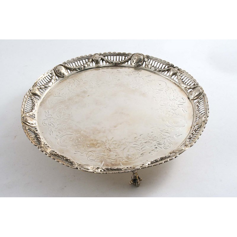 A Victorian small engraved circular salver, with ball & claw feet and a cast & pierced border of foliate festoons, portrait medallion & urns, the reverse inscribed "Denis Kelly on the occasion of his marriage from Winston and Clementine Churchill 1958" by D & C. House, London 1869; 7.5" (19 cms) diameter; 12.1 oz