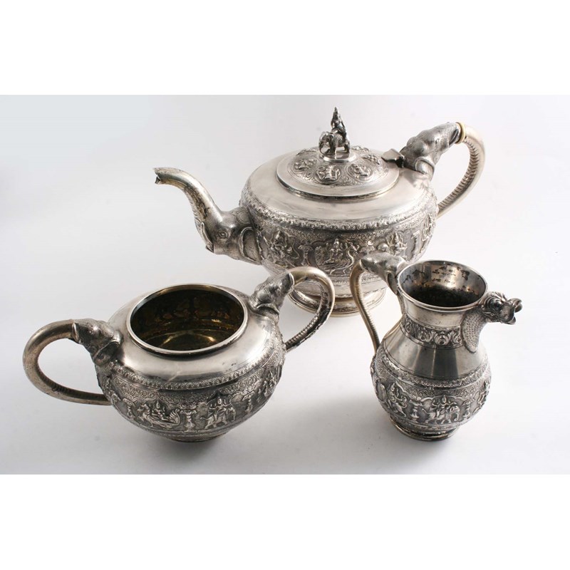 A LATE 19TH / EARLY 20TH CENTURY INDIAN LARGE EMBOSSED THREE-PIECE TEA SET with cast elephant mask handles, a trumpeting elephant mask spout on the tea pot and a Garuda head milk jug spout, the circular bodies with upper & lower bands with a plain satin finish, by Tarachund Parsram, Bombay c.1900; the tea pot 7.7" (19.4 cms) high overall; 67.1 oz (3)
