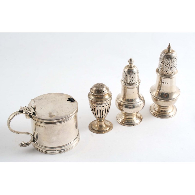 An Edwardian plain drum mustard pot (blue glass liner), by Stokes & Ireland Ltd., Chester 1908 (retailed by Depree & Young Ltd. of Exeter) and three various casters (one with a blue glass liner); the mustard 2.75" (7 cms) high; 10.6 oz weighable silver (4)