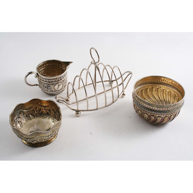 A late Victorian small bowl with wrythen fluting, initialled, by Hilliard & Thomason, Birmingham 1885, a small embossed cream jug by W. Gibson & J. Langman, London 1885, a small embossed bowl with a wavy rim by George Gillet, London 1888 and an Edwardian toast rack; the latter 6.9" (17.5 cms) long; 12.75 oz (4)