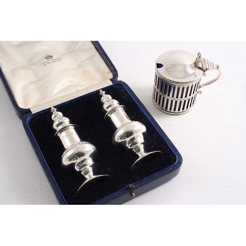 with a blue glass liner by George Perkins, London 1921 and a cased pair of pepperettes by Messrs. Townley & Thomas, London 1933; the mustard 3" (7.5 cms) high; 8.3 oz weighable silver (2)