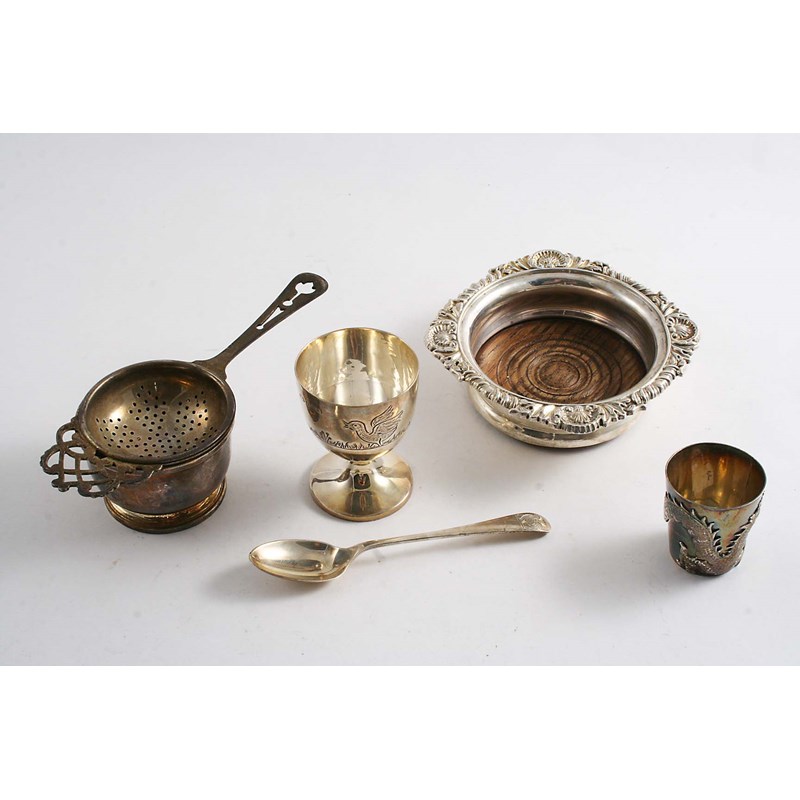 A child's egg cup engraved with chickens & a duck, with spoon, a tea strainer & drip bowl, an Edwardian small coaster with inset wooden base, and a small Chinese tot beaker with an applied dragon, by Wang Hing, 1900-1920; the latter 1.5" (3.8 cms) ; 5.2 oz weighable silver (6)